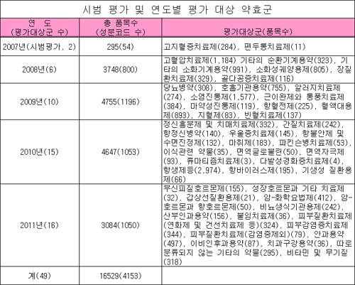 앞서 복지부는 올해 고지혈증·편두통치료제 시범평가를 시작으로, 2008년 6개 약효군, 2009년 10개 약효군, 2010년 15개 약효군, 2011년 16개 약효군 순으로 총 49개 약효군에 대한 평가를 마치고, 5년 6개월 동안 기등재의약품 목록을 정비할 계획이라고 밝힌 바 있다.