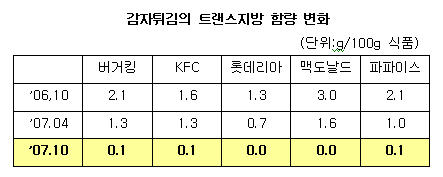 각 업체별 감자튀김의 트랜스지방 함량은 ▲버거킹 0.1g ▲KFC 0.1g ▲롯데리아 0.0g ▲맥도날드 0.0g ▲파파이스 0.1g 등으로 조사됐다. 이는 올 상반기의 평균 1.2g보다 크게 낮아진 수치다.