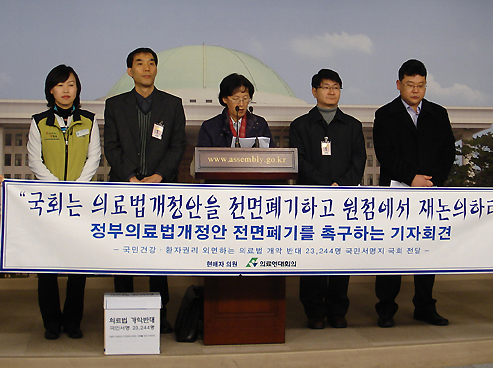 의협, 한의협, 치협, 간호조무사협회 등 의료단체와 참여연대, 경실련, 민주노총 등 27개 보건의료 시민사회단체의 연합체인 의료연대회의는 20일 국회에서 현애자 의원과 함께 정부의료법개정안 전면폐기를 촉구했다.