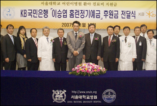 오병희 진료부원장은 “난치성 질환 환아를 지원하여 따스한 마음을 전달하는 이승엽 선수와 국민은행에 감사의 마음을 전한다” 며 “이 후원금은 현재 입원해 있는 흡인성폐렴과 터프팀장염으로 고생하는 환아들의 진료비로 소중하게 사용될 예정”이라고 말했다.