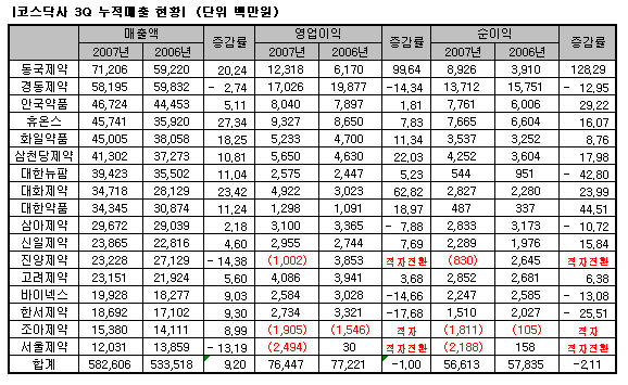 코스닥 제약사, 3분기 누적매출 9% 성장