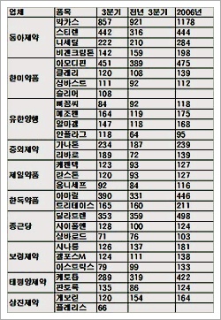 반면 동아제약 박카스가 지난 3분기 921억원 매출서 약 7% 하락한 857억원의 매출을 올리며 매출하락세가 이어지고 있으며, 유한양행의 삐콤씨(92억원→84억원), 한독약품의 훼스탈(73억원→72억원) 등 일반약 주력품목 매출이 약간 하락한 것으로 집계됐다.