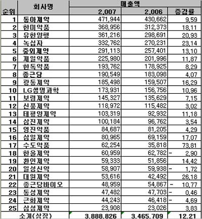 15일 데일리팜이 12월 결산 상장제약사 25곳의 2007년 3분기 매출현황을 집계한 결과, 평균 12.221%의 매출 성장률을 보인것으로 조사됐다. 영업이익은 4.91%성장했으며 순이익은 7.26% 마이너스 성장했다.