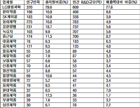 연구인력이 많은 순서대로 살펴보면 LG생명과학(320명), 유한양행(231명), 동아제약(225명), SK케미칼(183명), 한미약품(166명), 종근당(124명), 중외제약(121명) 순이다.