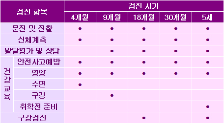 검진시기는 출생 후 4개월, 9개월, 18개월, 30개월, 5세 등 총 5차례로 18개월과 5세에는 치과에서 구강검진도 받을 수 있다. 다만 의료급여수급권자에 대한 검진은 내년 1월1일부터 시작된다.