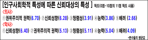 약사는 ①신뢰성향 > ②능력 > ③배려 > ④청렴성 > ⑤권위주의적 권력 순으로 조사돼 의사와 차이를 보였다.