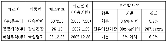 부적합 판정을 받은 한약규격품은 온누리의 '다솜반하'와 장생제약의 '장생건강', 국일무약의 '국일당귀'이다.