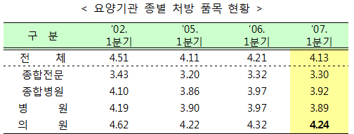 요양기관 종별로는 의원급(4.24)이 종합전문(3.30)보다 1개 품목 정도 더 많은 약이 처방되고 있는 것으로 나타났다.