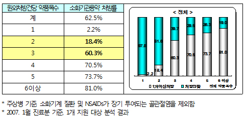 특히 소화기관용약의 경우 외래 처방률이 매우 높아 처방 품목수를 많아지게 하는 요인으로 작용하는 등 여전히 남용의 소지가 큰 것으로 분석됐다.