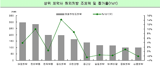 또 치매와 파킨슨병 치료제가 포함된 중추신경용약이 9.8%, 점악앤 등 안과용제가 9.2% 성장하며 증가율 2, 3위를 차지했다. 제약사별로는 동아제약과 한미약품, 유한양행 순으로 나타났다.