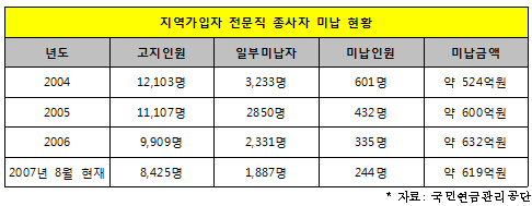 국민연금관리공단이 국회 보건복지위원회 소속 백원우의원(대통합민주신당)에게 제출한 자료에 따르면 전문직 종사자의 경우 고지 인원은 매년 감소추세임에도 불구하고 이들의 미납금액은 계속 증가하고 있다.