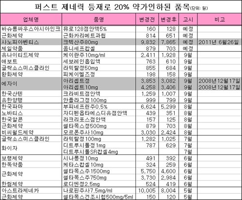 퍼스트 제네릭이 급여 등재되면서 80%로 약값이 인하된 오리지널 의약품이 27개로 늘어났다.