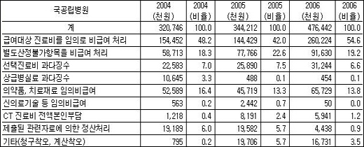 국공립병원의 진료비 과다청구는 전체 진료비 환불금액 증가와 연동해 연도별로도 2004년 3억2074만원, 2005년 3억4421만원, 2006년 4억7119만원 등으로 꾸준히 상승하고 있는 추세이다.