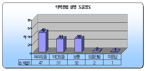 아울러 복약지도의 도움 평가에서는 매우 도움이 된다고 응답한 사람은 전체 42%에 해당하는 47명으로 나타났으며, 약간 도움이 된다고 응답한 사람은 27.7%인 31명으로 나타났다.