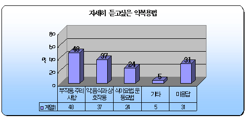 이어 전체 39.3%에 해당하는 44명이 "효능·효과에 대한 설명을 듣는다"고 답했으며, 약 이름이 13.4%인 15명, 저장방법이 17%인 19명, 부작용 및 주의사항이 20.5%인 23명, 음식 또는 다른 약과 상호작용이 14.3%인 16명, 기타 본인 요구 사항이 10.7%에 해당하는 12명으로 조사됐다.