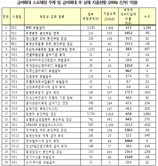 국회 보건복지위원회 소속 김춘진 의원은 18일 복지부 국정감사 자료를 통해 지난 2005년 이후 급여확대 26항목 중 재정추계 정확도가 90% 이상되는 항목이 단 1건에 불과하다고 밝혔다.