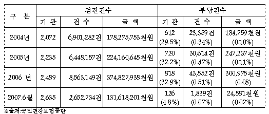 부당검진으로 적발된 기관이 2004년 612곳에서 2006년 818곳으로 점차 상승추세에 있는 것으로 나타났다.