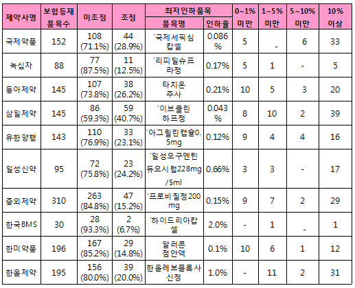 또한 조정된 품목 중에서도 1% 미만으로 인하된 품목은 전체 조정된 품목의 18.2%인 59개 품목으로, 5개 품목 중 1개 품목은 1% 미만의 인하를 실시한 것.