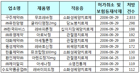 이중 소화성 궤양 치료제인 구주제약의 무코레바정은 2833건이, 당뇨병 치료제인 유한양행의 글라디엠정은 289건이, 십이지장 궤양 치료제인 한국파비스의 레바피론정의 경우 198건이 각각 처방됐다.