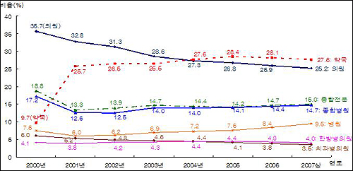반면, 의원의 경우 2000년 35.7%에서 32.8%, 31.3%, 28.6%, 27.3%, 26.8%, 25.9%, 25.2%로 지속 감소한 것으로 집계됐다.