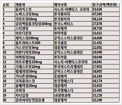 지난해 4위를 기록했던 아모디핀은 스티렌에 밀려 6위로 내려앉았지만, 청구액 256억원으로 지난해(456억 원)보다 큰 폭으로 성장하면서 올해 청구실적 500억 원대 이상이 확실시되고 있다.