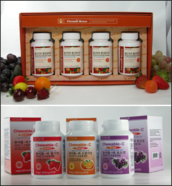 비타민하우스 ‘츄어블-씨’는 비타민C 500mg과 자일리톨, 유산균 2종을 함유하고 있으며 오렌지, 딸기, 포도 3가지 맛으로 구성됐다.