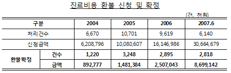 건강보험심사평가원이 국회 보건복지위원회 소속 문희 의원에게 제출한 자료에 따르면 환자의 진료비용 확인신청금액 중 환불 확정된 금액은 2004년에 9억원, 05년 15억원, 06년 25억원, 올해 상반기에는 87억으로 환불확정 금액이 2004년에 비해 10배 가까이 늘었다.