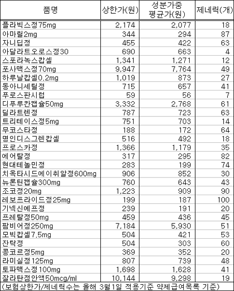 - 다빈도처방약 30개 성분 분석…평균 낙폭 11.9% 불과