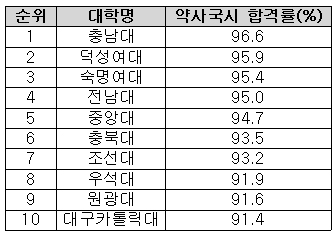 숙명약대가 95.4%로 3위를, 중앙약대가 94.7%로 5위를 차지한 것을 빼면, 전남약대와 충북약대, 조선약대, 우석약대, 원광약대, 대구가톨릭대가 순위에 순서대로 이름을 올렸다.