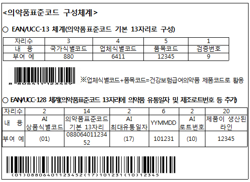 이중 전문약이나 지정의약품의 경우 이력추적이 가능하도록 제조번호와 우효기간 표시가 의무화 된 EAN/UCC-128코드가 사용된다.