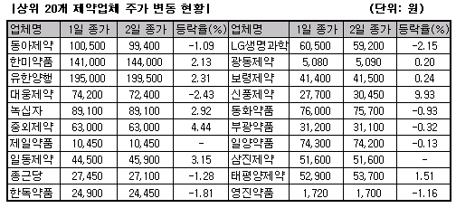 반면 대웅제약(-2.43%)과 LG생명과학(-2.15%), 한독약품(-1.81%), 종근당(-1.28%), 영진약품(-1.16%), 동아제약(-1.09%), 동화약품(-0.39%), 부광약품(-0.32%) 일양약품(-0.13) 등 9개 업체의 주가는 비교적 소폭으로 하락했다.
