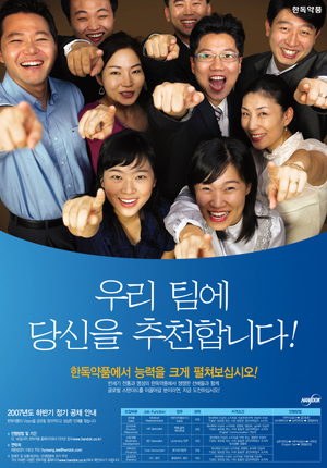 한독을 대표하는 남녀 직원 9명은 '우리 팀에 당신을 추천합니다'라는 채용광고 컨셉에 맞춰 지원 후보자들을 손가락으로 가리키며 바로 당신이 한독약품의 미래를 책임질 인재이니 한독약품에 당당히 입사 지원할 것을 권유했다.