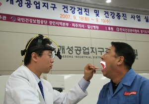 27일 공단 파주지사는 "개성공업 지구 근로자의 경우 건강검진 등 질병을 예방할 수 있는 시스템이 없어 국내 건강보험 가입자와 동등한 수혜를 받지 못한다는 판단에 따라 일산병원 의료진과 함께 출장 검진을 실시했다"고 밝혔다.
