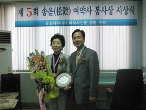 동성측은 김명애약사는 직접 몸으로 어려운 이웃을 돕는 참 의료인모습으로 약사회 위상을 높이고 진정한 봉사정신을 높이 평가되어 제5회 송음여약사봉사상 수상자로 선정했다고 강조했다.