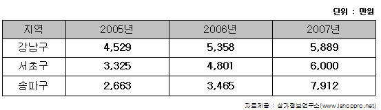 송파구는 지난 2005년 3.3㎡당 2,663만원이었지만, 2007년 접어들며 7,912만원을 기록했다.