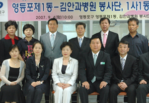 영등포1동사무소에서 치러진 결연식에서 김안과병원 봉사단(단장 손경수교수)과 영등포 1동(동장 이재강)은 협력과 교류를 통해 상호 지역사회의 발전과 주민간의 우의증진에 이바지하기로 의견을 모았다.