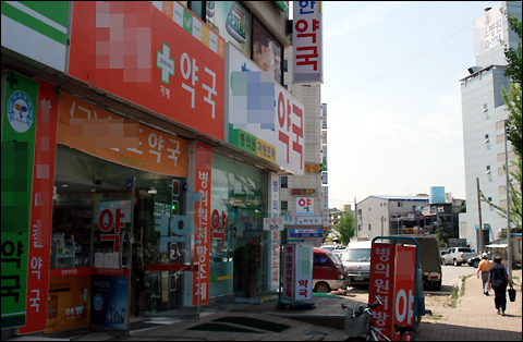 특히, 한 상가에 함께 위치한 A약국과 B약국간의 호객행위가 치열하게 이뤄지고 있었고, 이들 약국으로부터 50M쯤 떨어진 C약국은 병원 후문 바로 맞은편에 입간판을 세워놓고 환자 유치에 열을 올리고 있다.