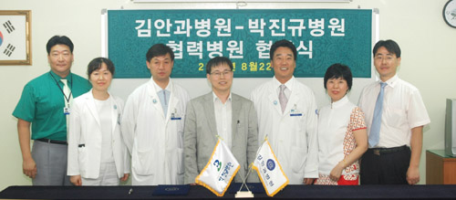 김안과병원과 박진규병원은 결연식에서 교환한 협약서를 통해 상호 환자의뢰, 검사의뢰 및 회신, 병원경영정보 교류 등 을 통해 서로의 발전을 꾀하고 국민건강 증진에 기여키로 했다.