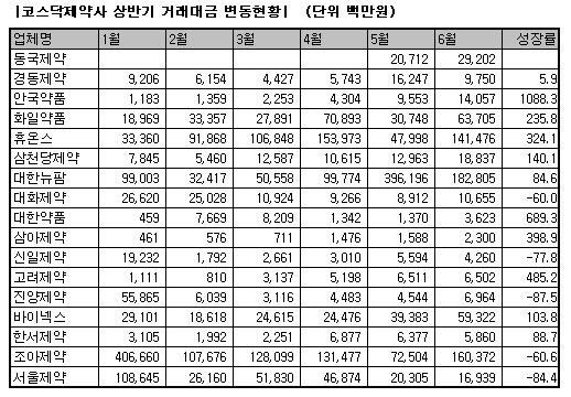 또 고려제약(485%)과 삼아제약(398%), 휴온스(324%) 역시 300% 이상 성장률을 기록하면서 상반기 활발하게 거래된 제약주에 속했다.