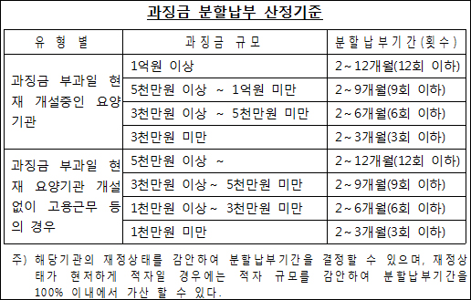 복지부는 과징금 분할납부 산정기준도 개정했다. 재해, 사업손실, 사업위기 등 과징금 전액 납부가 어렵다고 판단되면 분할납부가 가능하다.