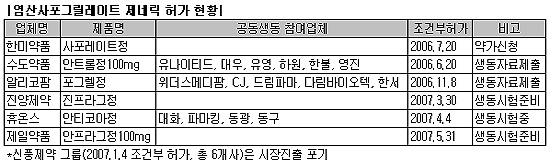 또 2006년 11월 조건부허가를 받은 알리코팜(포그렐정, 총 6개사) 그룹도 현재 생동자료 제출을 완료해 비슷한 시기에 12개 업체의 제네릭 후속허가가 나올 것으로 보인다.