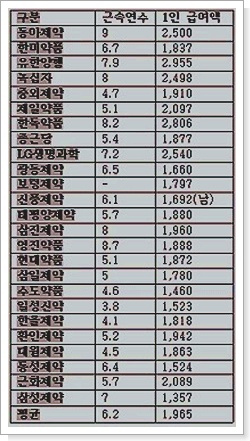 또한 근속연수의 경우 중외제약(4.7년), 제일약품(5.1년) 등이 상위제약사 중 최하위권에 속해 있는 것으로 분석됐다.