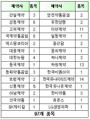 약가 재산정 대상 제약사별 현황을 보면 한국유나이티드제약이 14품목으로 가장 많았고 하원제약 13품목, 이연제약 11품목, 국제약품 8품목, 경동제약 6품목 등 총 28개 제약 97품목이었다.