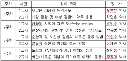 강좌는 오후 9시부터 자정까지 1·2교시로 나뉘어 진행되며, '월요일- 고양시(충정교회·031-966-7796), 화요일- 부천시(부천시약사회관·032-322-9303), 목요일- 수원시(의왕시 농협·031-234-5945), 금요일-성남시(성남시약사회관·031-756-7211)' 순으로 개최된다.