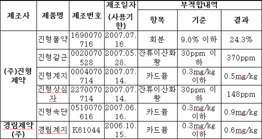 진형제약의 진형물약 등 한약규격품 6개 품목이 카드뮴 등이 기준치 이상 검출돼 품질부적합 판정을 받았다.