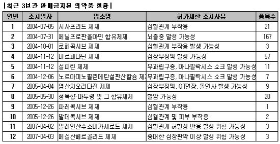 2007년 들어서는 현재까지 2개 제제가 4월달에 판매금지 됐다.