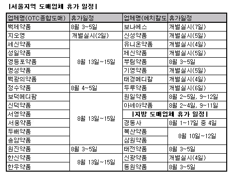 서울시도매협회 산하 남부분회에 속하는 세신, 성일, 영등포, 명성, 백광약품은 13일부터 15일까지 휴가를 계획하고 있으며 신설동 소재 도매업체들 역시 광복절을 전후로 휴가를 실시할 예정이다.