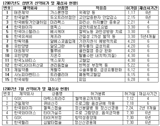 또 젤독스캡슐은 2년 8개월간 재심사기간이 설정됐는데 허가변경 등으로 이미 받았던 6년 중 잔여기간만 인정된 케이스에 해당된다. 한편 지난달 18일 허가받은 SK케미칼의 발기부전치료 국산신약 '엠빅스정'은 포함되지 않았으나 조만간 6년간 신약재심사 품목으로 지정받을 전망이다.