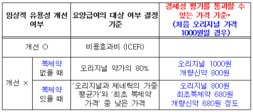 1) 임상적 유용성 개선된 경우 비용효과비(ICER : Incremental Cost -Effectiveness Ratio - 신청 약제와 비교 대상 약제의 임상효과와 치료기간 동안의 투약비용을 수치화한 지표 2) 임상적 유용성 개선이 없는 경우 (비용의 기준) ① 개량신약의 목표가 된 기존 신약에 대한 복제의약품이 등재되어 있지 않은 경우, 그 기존 신약 약가의 80% ② 개량신약의 목표가 된 기존 신약에 대한 복제의약품이 등재되어 있는 경우, ‘개량신약의 목표가 된 기존 신약과 그에 대한 복제의약품 가격의 가중 평균가’와 ‘첫 번째 복제의약품 가격’ 중 낮은 가격 [개념] 1) (신물질) 신약 : 화학구조나 본질 조성이 전혀 새로운 신물질의약품 또는 신물질을 유효성분으로 함유한 복합제제 의약품으로서 식품의약품안전청장이 지정하는 의약품(약사법 제2조제8호) 2) 개량신약 : 기존 신약의 구조를 변형, 제제개선, 신규용도 발견, 복합제 발견 등을 통하여 기존 의약품 보다 개선된 의약품 (국내법령상 공식적인 정의가 없으며, 약사법령상 「의약품등의 안전성·유효성 심사에 관한 규정」의 “자료제출의약품”이 이에 해당함) 3) 오리지널 의약품 (최초등재품목 의약품) : 동일 투여경로, 동일 성분, 동일 제형 및 동일 함량 제품이 등재되어 있지 않은 상태에서 최초로 등재되는 품목의 의약품(보건복지부 고시 「신의료기술등의 결정 및 조정 기준」[별표2] 약제 상한금액의 산정기준 제1호) 4) 복제 의약품 (제네릭 의약품) : 동일 투여경로, 동일 성분, 동일 제형 및 동일 함량 제품이 이미 등재된 후 등재되는 의약품 (보건복지부 고시 「신의료기술등의 결정 및 조정 기준」[별표2] 약제 상한금액의 산정기준 제1호)