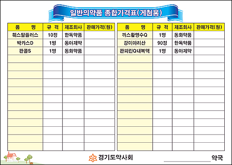도약사회는 총 3,500여장의 종합가격표를 제작, 이번주까지 복약지도·정률제 관련 포스터 등과 함께 각 회원약국으로 발송을 마무리 지을 방침이다.